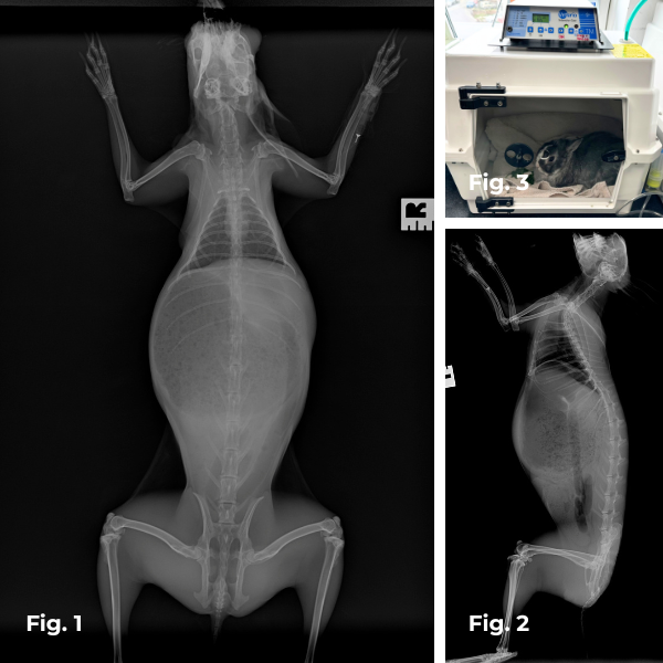 Figure 2: Lateral radiograph illustrating the extent of gastric distension and displacement of abdominal structures associated with obstruction. Incubator use in an obstructed rabbit case